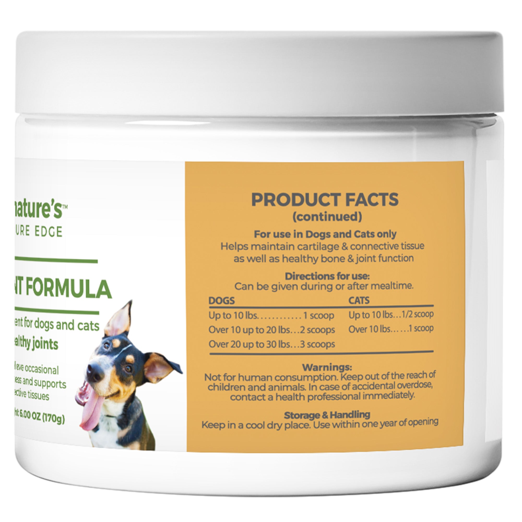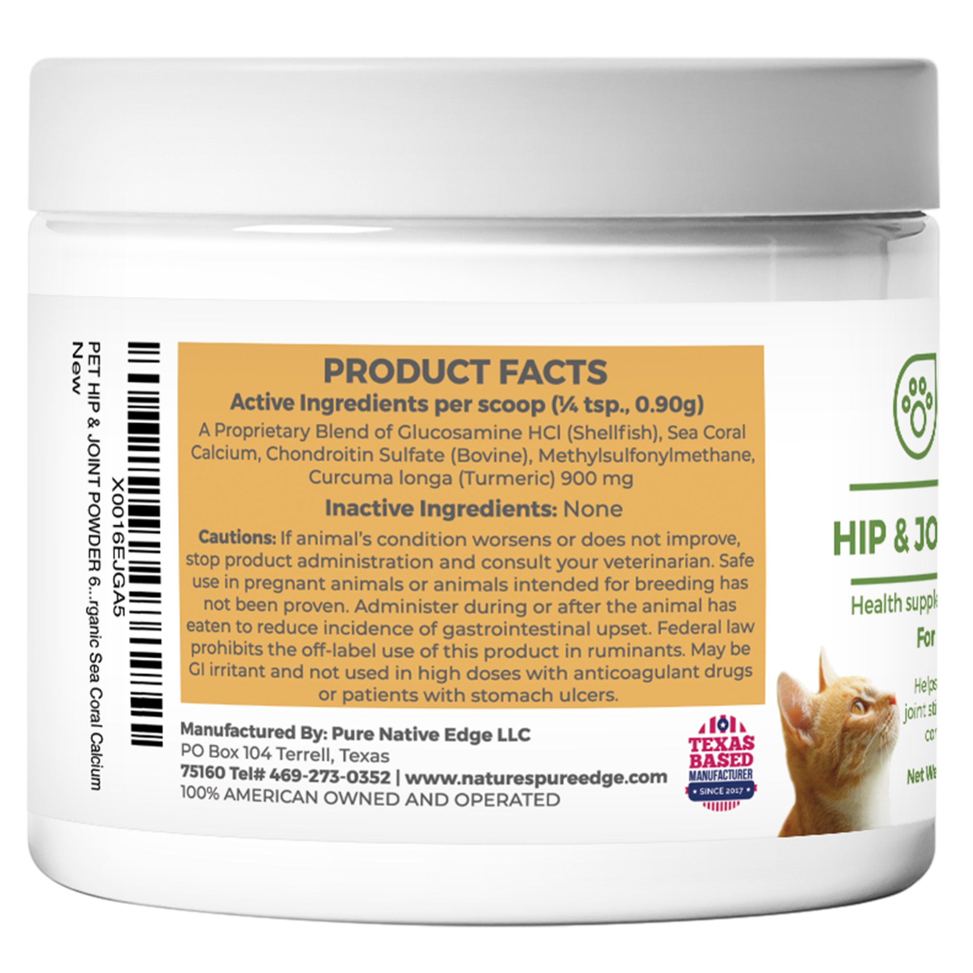 Nature’s Pure Edge Hip & Joint Powder Supplement for Dogs and Cats. This extra-strength, concentrated formula features a potent blend of glucosamine, chondroitin, MSM, and turmeric – some of the most powerful joint-supporting ingredients available. Together, they help maintain healthy cartilage, lubricate joints, and support a healthy inflammatory response, so your dog or cat can move with ease and stay active. Whether you have an energetic puppy or a senior pet showing signs of stiffness, this supplement is designed to support joint health at all life stages.